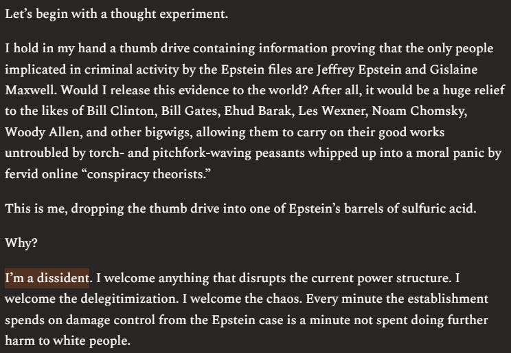 Greg Johnson claims that, if he had “the truth about Epstein,” he would hide that truth from the world. This is because he opposes the elites. In a propaganda war, truth is secondary.