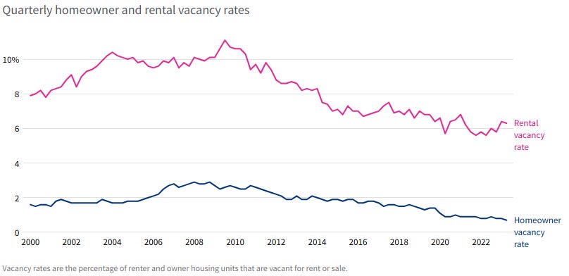 But maybe the problem isn’t that we don’t build enough, but that greedy landlords are hording all the housing for themselves? No true: vacancy rates are at all time lows.